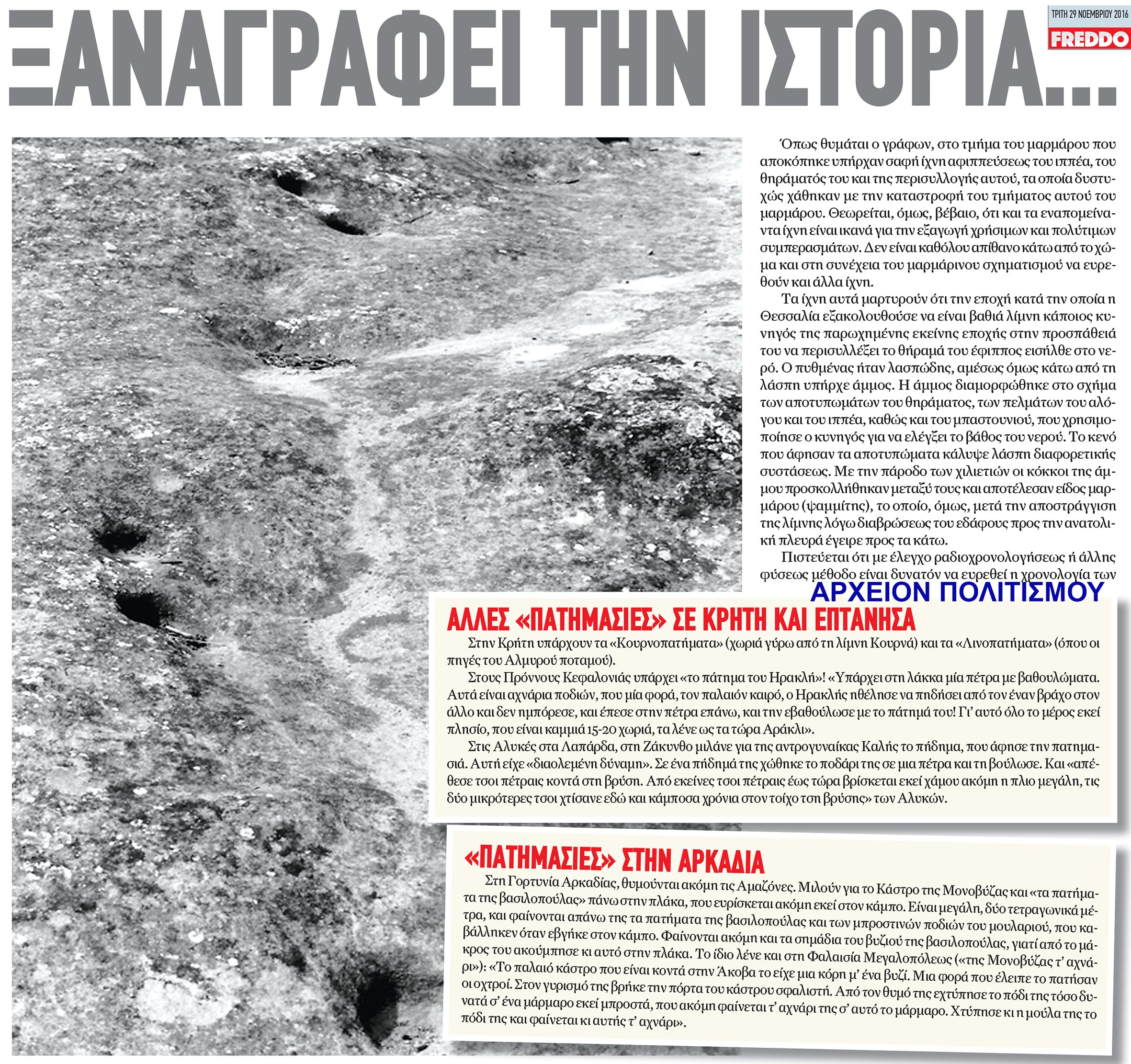 Με τον συλλογισμό αυτό, – συνεχίζει ο κ. Ψιμόπουλος – τα σημάδια επάνω στον βράχο, που φέρει το μυθικό όνομα “Του Δράκου η Πατημασιά”, πρέπει να έγιναν κάπου 300.000 χρόνια πριν από την εποχή μας, χρονολογία που δεν πρέπει να μας φανεί υπερβολική. Τα χρονικά όρια της εμφανίσεως του ανθρώπου επάνω στην Γη μετά από τις τελευταίες ανακαλύψεις έχουν επιμηκυνθεί σημαντικά. Έρευνες επάνω στο DNA, έδειξαν ότι οι πρόγονοί μας άνθρωποι του Neanderthal και του Σοφού [Sapiens], είχαν εξαπλωθεί επάνω στην Γη 550.000 – 690.000 χρόνια πριν από την εποχή μας. Προσφάτως: