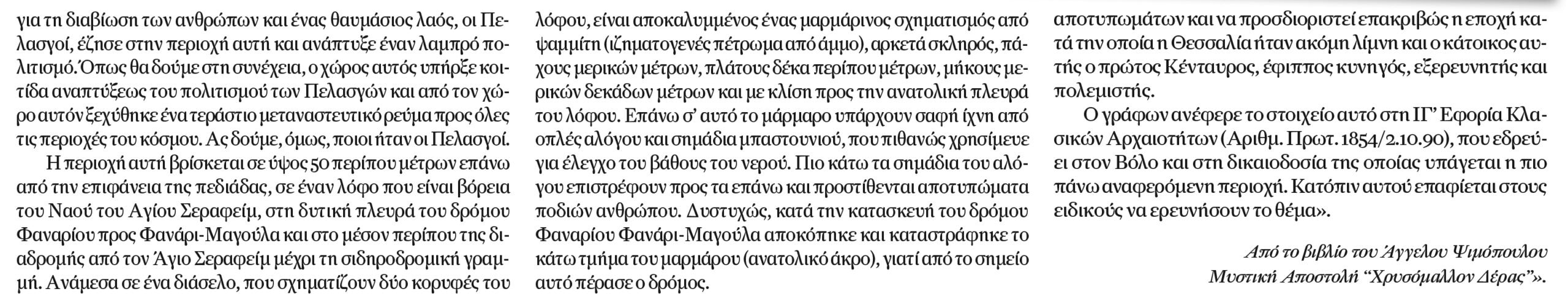 Ο γράφων ανέφερε το στοιχείο αυτό στη ΙΓ’ Εφορεία Κλασσικών Αρχαιοτήτων [Αρ. Πρωτ. 1854/2.10.90], που εδρεύει στον Βόλο και στην δικαιοδοσία της οποίας υπάγεται η πιο πάνω αναφερόμενη περιοχή. Κατόπιν αυτού επαφίεται στους ειδικούς να ερευνήσουν το θέμα. – ΠΗΓΗ: Από το βιβλίο του Ά. Ψιμόπουλου «Μυστική Αποστολή “Χρυσόμαλλον Δέρας”».