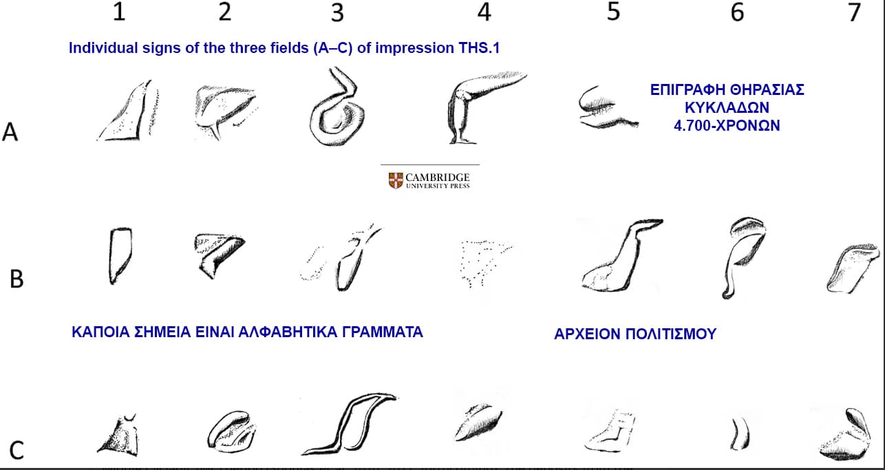 Έως τώρα οι επιστήμονες έλεγαν πως «οι πρώτες γνωστές μορφές γραφής στο Αιγαίο (κρητικά ιερογλυφικά ή Γραμμική Α), εμφανίσθηκαν πριν 4.000 χρόνια». Αλλά τώρα ευρέθησαν σφραγίδες με γραφή στην Κοίμηση της Θηρασιάς Κυκλάδων, 4.700 – 4.300 χρόνων!