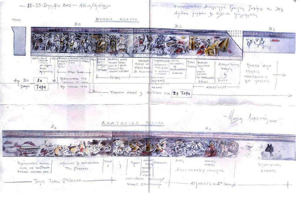 Το 2016 στο ΑΕΘΜ ο αρχιτέκτονας Μιχάλης Λεφαντζής παρουσίασε για πρώτη φορά μια αναλυτική περιγραφή της γραπτής ζωφόρου, επισημαίνοντας ότι τα επτά τμήματα της ζωφόρου τοποθετήθηκαν μετά τις αρχιτεκτονικές παρεμβάσεις για την τοποθέτηση της μαρμάρινης θύρας και είναι σε κατεύθυνση από Ανατολή προς δύση, με διαφορετικό ύψος μεταξύ τους. Τα επτά τμήματα της ζωφόρου βρέθηκαν στην ανατολική πλευρά του τρίτου θαλάμου και έχουν ύψος 25 εκ στην ανατολική και 20 στην δυτική πλευρά. Η τοποθέτηση τους και οι οικοδομικές επεμβάσεις αξίζει να σημειώσουμε ότι έγιναν την τελευταία 20ετία του 4ο αιώνα και επίσης αυτή την περίοδο, έχουμε και το άνοιγμα του κιβωτιόσχημου τάφου του τέταρτου θαλάμου που μέχρι τότε, είχε μόνο δευτερογενείς τελετουργικές ταφές αλλά και άλλα. Ο μοναδικός ολοκληρωμένος σκελετός ήταν αυτός της 60χρονης γυναίκας που ρίχθηκε στο όρυγμα, ακολούθησε επίχωση μέχρι το επίπεδο του πώρινου δαπέδου και σφράγιση του χώρου του τετάρτου θαλάμου, με την μαρμάρινη θύρα.