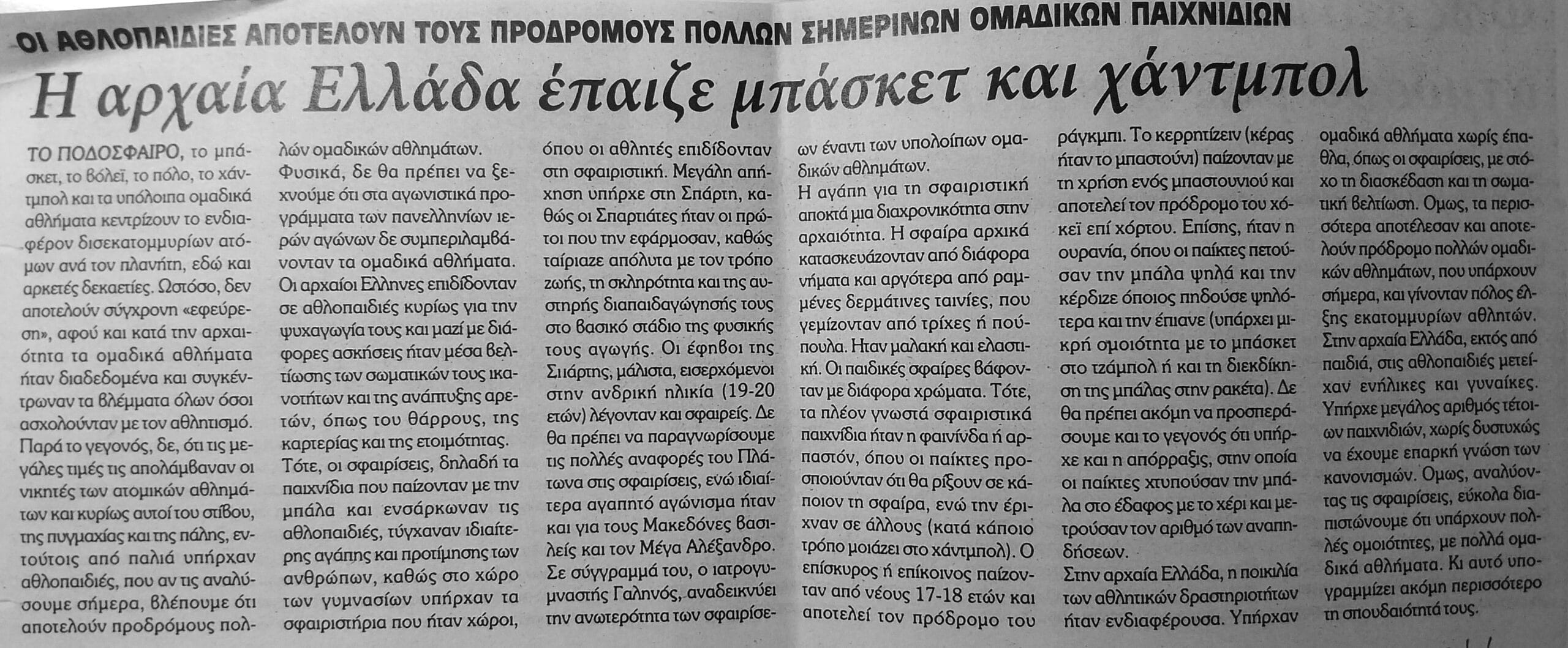 ΠΗΓΗ: άρθρο με τίτλο «ΟΙ ΑΘΛΟΠΑΙΔΙΕΣ ΑΠΟΤΕΛΟΥΝ ΤΟΥΣ ΠΡΟΔΡΟΜΟΥΣ ΠΟΛΛΩΝ ΣΗΜΕΡΙΝΩΝ ΟΜΑΔΙΚΩΝ ΠΑΙΧΝΙΔΙΩΝ – Η αρχαία Ελλάδα έπαιζε μπάσκετ και χάντμπολ», εφημ. ΜΕΣΟΓΕΙΟΣ, 9.1.2011. ΑΡΧΕΙΟΝ ΠΟΛΙΤΙΣΜΟΥ, 10.1.2011.